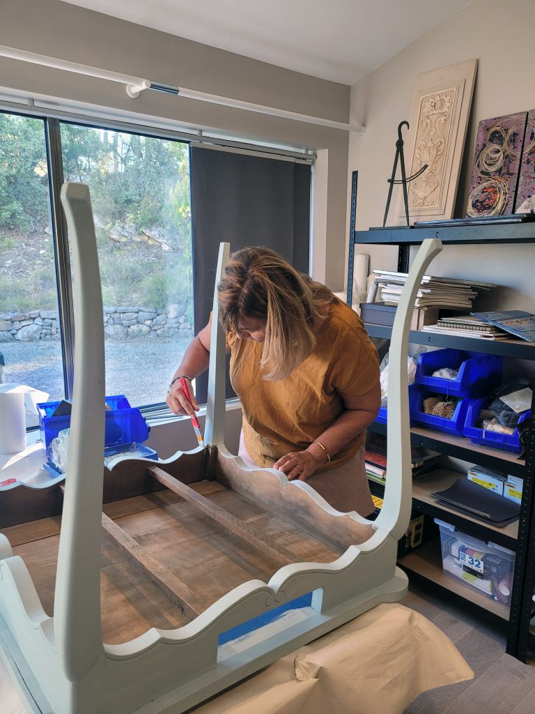 Le deuxième type de stage d’une semaine complète était dédié à la rénovation de mobilier vintage. L’objectif était clair : inculquer les bases du métier de peintre sur mobilier, des bons outils aux gestes précis, pour redonner vie à des pièces parfois oubliées. Décapage, ponçage, préparation du bois, mise en peinture…chaque étape a été abordée avec soin. C’était fascinant de voir les meubles se transformer sous les mains des stagiaires. C’est un travail qui demande patience et délicatesse, et je suis fière de la passion et de l’engagement dont elles ont fait preuve.