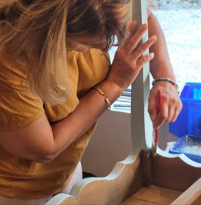 Le deuxième type de stage d’une semaine complète était dédié à la rénovation de mobilier vintage. L’objectif était clair : inculquer les bases du métier de peintre sur mobilier, des bons outils aux gestes précis, pour redonner vie à des pièces parfois oubliées. Décapage, ponçage, préparation du bois, mise en peinture…chaque étape a été abordée avec soin. C’était fascinant de voir les meubles se transformer sous les mains des stagiaires. C’est un travail qui demande patience et délicatesse, et je suis fière de la passion et de l’engagement dont elles ont fait preuve.